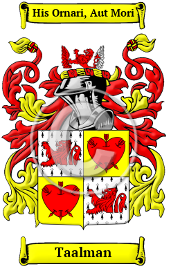 The surname Taalman was first found in Germany, where the name Tasman came from humble beginnings but gained a significant reputation for its contribution to the emerging mediaeval society. It later became more prominent as numerous branches of the same house acquired distant estates, some of which were located in other countries. Through the acquisition of these estates as well as their important contributions to society, the family successfully elevated their social status.