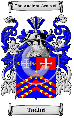 The surname Tadini was first found in Florence (Italian: Firenze), originally the capital of Tuscany, then capital of the kingdom of Italy. On the River Arno there are numerous Florentine Churches, Museums, Galleries. It dates back to 313 A.D. The history is complex and turbulent. The de' Medici family are the notables. They were expelled in 1494 but they returned in 1512, out in 1527 and then returned. In those ancient times only persons of rank, the podesta, clergy, city officials, army officers, artists, landowners were entered into the records. To be recorded at this time, at the beginning of recorded history, was of itself a great distinction and indicative of noble ancestry. Philppo di Taddeo was recorded as a magistrate in Florence 1380.