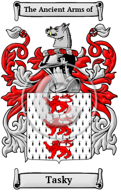 England Etymology of TaskyWhat does the name Tasky mean? The surname Tasky comes from the Middle English "taske" from the Latin "taxare" meaning "to appraise." Like most Latin based words in English, it was introduced by the Normans. It came to be used as a surname to denote an appraiser, and later it came to mean one who performed a specific task, like threshing or reaping. Another source claims the word "tasker" was given to a labourer who received his wages in kind for a certain task and yet another claims the name was a trade name for a thrasher or a reaper. 1 Early Origins of the Tasky familyThe surname Tasky was first found in Essex, where Taske appears in records of 1185. John le Tasker was listed in the Assize Rolls of Northumberland in 1279 and in the same year, Benedict le Taskur was listed in the Rotuli Hundredorum. 2 Early History of the Tasky familyThis web page shows only a small excerpt of our Tasky research. Another 60 words (4 lines of text) covering the years 1273, 1279, 1307, 1379, 1690, 1752, 1753 and 1768 are included under the topic Early Tasky History in all our PDF Extended History products and printed products wherever possible. Tasky Spelling VariationsMultitudes of spelling variations are a hallmark of Anglo Norman names. Most of these names evolved in the 11th and 12th century, in the time after the Normans introduced their own Norman French language into a country where Old and Middle English had no spelling rules and the languages of the court were French and Latin. To make matters worse, medieval scribes spelled words according to sound, so names frequently appeared differently in the various documents in which they were recorded. The name was spelled Taske, Tasker, Taskur, Task and others. Early Notables of the Tasky familyAnother 34 words (2 lines of text) are included under the topic Early Tasky Notables in all our PDF Extended History products and printed products wherever possible. Migration of the Tasky familyBecause of this political and religious unrest within English society, many people decided to immigrate to the colonies. Families left for Ireland, North America, and Australia in enormous numbers, traveling at high cost in extremely inhospitable conditions. The New World in particular was a desirable destination, but the long voyage caused many to arrive sick and starving. Those who made it, though, were welcomed by opportunities far greater than they had known at home in England. Many of these families went on to make important contributions to the emerging nations of Canada and the United States. Analysis of immigration records indicates that some of the first North American immigrants bore the name Tasky or a variant listed above: Dinah Tasker, who immigrated to Barbados in 1659; Thomas Tasker, who was sent to a plantation in Virginia in 1668; Thomas Tasker and John Tasker, who settled in Maryland in 1673 and 1674.