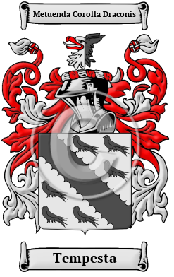 | Tempesta History, Family Crest & Coats of Arms Etymology of TempestaWhat does the name Tempesta mean? The proud Norman name of Tempesta was developed in England soon after Norman Conquest of England in 1066. It was name for a person with a quick or furious temper. The name is a metaphor derived from the Old French word tempeste, meaning storm. A broad and miscellaneous class of surnames, nickname surnames referred to a characteristic of the first person who used the name. They can describe the bearer's favored style of clothing, appearance, habits, or character. "The name is difficult to account for: it may have reference to some storm which the first bearer encountered." 1 Early Origins of the Tempesta familyThe surname Tempesta was first found in Yorkshire where the this ancient family is traced to Roger Tempest 1, "progenitor of this the oldest and most distinguished of the Craven families now surviving. That this man was a Norman the name will not permit us to doubt; that he was a dependant of Roger of Poitou is extremely probable; that he was at all events possessed of Bracewell (in Craven) early in the reign of Henry I., is absolutely certain." 2 Roger Tempest held three carucates and two oxgangs on land in the Shipton Fee, co. York. 1 Later, the chapelry of Tong, in the West Riding of Yorkshire was home to another branch of the family. "The manor, including the hamlets of Cutler-Height, Far-Street, Rycroft, Holme, and Westgate-Hill, comprises by admeasurement 2643 acres, principally the property of Col. John Plumbe Tempest. Tong Hall, the seat of Col. Tempest, is a stately mansion, erected by Sir George Tempest, on the site of an ancient Hall occupied by the De Tonge, Mirfield, and Tempest families for more than 750 years; it is situated in a finely-wooded demesne, comprising much beautiful scenery, and commanding extensive views." 3 Early History of the Tempesta familyThis web page shows only a small excerpt of our Tempesta research. Another 126 words (9 lines of text) covering the years 1100, 1400, 1434, 1558, 1562, 1594, 1653, 1675, 1678, 1679, 1680, 1689, 1697, 1700, 1707, 1708, 1717 and 1738 are included under the topic Early Tempesta History in all our PDF Extended History products and printed products wherever possible. Tempesta Spelling VariationsSpelling variations in names were a common occurrence in the eras before English spelling was standardized a few hundred years ago. In the Middle Ages, even the literate regularly changed the spellings of their names as the English language incorporated elements of French, Latin, and other European languages. Many variations of the name Tempesta have been found, including Tempest, Tempeste and others. Early Notables of the Tempesta familyRobert Tempest, English High Sheriff of Durham from 1558-1562; Sir Thomas Tempest KT. (1594-1653), Attorney-General of Durham; and his son, John Tempest (died 1697), an English politician, Member of Parliament for County Durham (1675-1679); Pierce Tempest (1653-1717), English printseller, best known for the series Cryes of the City of London; William... Another 51 words (4 lines of text) are included under the topic Early Tempesta Notables in all our PDF Extended History products and printed products wherever possible. Migration of the Tempesta family to IrelandSome of the Tempesta family moved to Ireland, but this topic is not covered in this excerpt. More information about their life in Ireland is included in all our PDF Extended History products and printed products wherever possible. Migration of the Tempesta familyFor many English families, the social climate in England was oppressive and lacked opportunity for change. For such families, the shores of Ireland, Australia, and the New World beckoned. They left their homeland at great expense in ships that were overcrowded and full of disease. Many arrived after the long voyage sick, starving, and without a penny. But even those were greeted with greater opportunity than they could have experienced back home. Numerous English settlers who arrived in the United States and Canada at this time went on to make important contributions to the developing cultures of those countries. Many of those families went on to make significant contributions to the rapidly developing colonies in which they settled. Early North American records indicate many people bearing the name Tempesta were among those contributors: Edward Tempest settled in Virginia in 1653; Robert Tempest settled in Virginia in 1635.