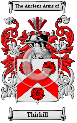 England Etymology of ThirkillWhat does the name Thirkill mean? The Thirkill surname is derived from an Old Norse personal name, which was in common use throughout England during the Middle Ages. Early Origins of the Thirkill familyThe surname Thirkill was first found in Yorkshire where the family name was first referenced in the 11th century when they held estates in that shire. 1 Thurkill, Thorkill or Turgesius (d. 845), was the Danish king of North Ireland and presumed to have been the son of Harold Harfagr as Snorri Sturleson. "He has, however, with more probability been identified with Ragnar Lodbrok, the half-mythical king of Denmark and Norway. As Thurkill he arrived in Ireland with a royal fleet in 832. He took Dublin in the same year, and afterwards assumed the government of all the northmen in Ireland. A few years later, perhaps in 841, Thurkill drove out the abbot of Armagh and assumed the abbacy. in 845, he was taken prisoner by Malachy, then king of Meath (afterwards king of Ireland), and drowned in Loch Owel in what is now Westmeath. " 2 His brother, Thurkill or Thorkill (fl. 1009), was a Danish invader, is said to have come to England to avenge a brother, possibly one of the victims of the massacre of St. Brice's Day, 13 Nov. 1002. 2 Roger de Thurkilbi (d. 1260), was an early English judge, the son and heir of Thomas de Thurkilbi, who took his name from a hamlet in the parish of Kirby Grindalyth in the East Riding of Yorkshire. 2 Early History of the Thirkill familyThis web page shows only a small excerpt of our Thirkill research. Another 172 words (12 lines of text) covering the years 1190, 1415, 1420, 1455, 1487, 1510 and 1600 are included under the topic Early Thirkill History in all our PDF Extended History products and printed products wherever possible. Thirkill Spelling VariationsSpelling variations of this family name include: Thirkell, Thirkeld, Thirkill, Thirkel, Thirkle, Thirkill, Therkle, Therkill, Therkill, Therkill, Therkeld, Thurkell, Thurkettel, Thurkettle, Thirkettle, Thurtle, Thorkill, Thurkill, Thirhill, Therkhill, Turkell, Tirkell, Terkill, Turgell, Turgill, Tergill, Toghill, Tirchell, Tirchill and many more. Early Notables of the Thirkill familyMore information is included under the topic Early Thirkill Notables in all our PDF Extended History products and printed products wherever possible. Migration of the Thirkill familySome of the first settlers of this family name or some of its variants were: Joseph Thirkell, who came to New York in 1801; Thomas Thirkell, who settled in New York in 1801; John Thurkeld, and his wife Mary Farmer, who came to Alexandria VA in 1820.