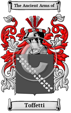 | Toffetti History, Family Crest & Coats of Arms Early Origins of the Toffetti familyThe surname Toffetti was first found in Venice (Italian: Venezia), and seaport occupying one of the most remarkable sites of the world. Centralizing on the Grand Canal the history of the city can be traced through the different styles of architecture Byzantine, Gothic, early Renaissance and late Renaissance. It is rich in ancient palaces, churches, libraries, galleries, monuments, statues, treasures and artifact. Its history is abundant in politics, art, religion, scholarship and conflict. The ducal palace was commenced in 1309. In those ancient times only persons of rank, the podesta, clergy, city officials, army officers, artists, landowners were entered into the records. To be recorded at this time, at the beginning of recorded history, was of itself a great distinction and indicative of noble ancestry. Early History of the Toffetti familyThis web page shows only a small excerpt of our Toffetti research. Another 58 words (4 lines of text) covering the years 1550, 1597, 1605 and 1649 are included under the topic Early Toffetti History in all our PDF Extended History products and printed products wherever possible. Toffetti Spelling VariationsSpelling variations of this family name include: Tofano, Tofani, Toffano, Toffani, Toffalo, Toffali, Toffalo, Toffolo, Toffli, Tofful, Foffano, Foffani, Tofanelli, Tofanini, Tofanari, Toffanello, Toffanini, Toffanin, Toffoletti, Toffolet, Toffetti, Toffolini, Toffoloni, Toffolon, Toffoloni, Toffolato, Toffolatti, Toffano and many more. Early Notables of the Toffetti familyMore information is included under the topic Early Toffetti Notables in all our PDF Extended History products and printed products wherever possible. Migration of the Toffetti familySome of the first settlers of this family name or some of its variants were: Sebastian Tofanelli, who arrived in America on October 3, 1887 aboard the "La Bretagne"; Luigi Tofelli, who arrived in San Francisco, California on July 31, 1893 aboard the ".