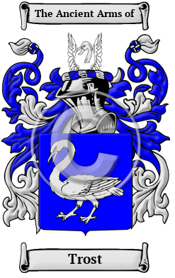 Germany Early Origins of the Trost familyThe surname Trost was first found in the province of Mecklenburg, where the name was closely identified in early mediaeval times with the feudal society which would become prominent throughout European history. The name can be traced in this region back to 1506, when they were vassals to the Prince von Werle. They would later emerge as a noble family with great influence, having many distinguished branches, and become noted for its involvement in social, economic and political affairs. Chronicles first mention Friedrich Trost of Hamburg in 1260, Waczlaw Trost of Prag in 1375, and Fridel Troestel of Prague in 1359. Early History of the Trost familyThis web page shows only a small excerpt of our Trost research. Another 78 words (6 lines of text) covering the year 1500 is included under the topic Early Trost History in all our PDF Extended History products and printed products wherever possible. Trost Spelling VariationsSpelling variations of this family name include: Trost, Troest, Troste, Troeste, Troist, Troester, Troster, Troestel and many more. Early Notables of the Trost family- Vicke Trost and his sons Claus and Joachim Trost, members of the old Mecklenburg noble family who served the Prince of Werle and were prominent in the affairs of the region around 1500