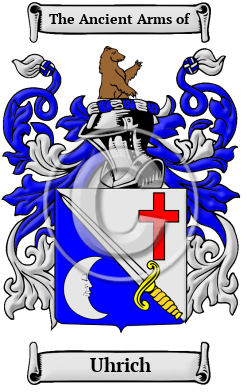 Germany Etymology of UhrichWhat does the name Uhrich mean? The distinguished and ancient German surname Uhrich is derived from the old Germanic personal name "Ulrich," which is itself derived from the Old High German "uodal," meaning "homeland," and the Germanic "rik," meaning "king." This personal name has been popular in South Germany, Switzerland, and Austria since the Middle Ages due to the fame of St. Ulrich, the bishop of Augsburg, Bavaria, who twice led the defense of his city against Hungarian attacks in the 10th century. Early Origins of the Uhrich familyThe surname Uhrich was first found in South Germany, where this variation of the name is thought to have emerged. The earliest known bearer of the name was Conrad Urrici, who was a citizen of Strasbourg in 1498. The young Uhrich family was instrumental during this formative period, playing a major role in the early history of the region and contributing greatly to the development of medieval Swabian culture. Early History of the Uhrich familyThis web page shows only a small excerpt of our Uhrich research. Another 96 words (7 lines of text) covering the years 1591, 1826 and 1879 are included under the topic Early Uhrich History in all our PDF Extended History products and printed products wherever possible. Uhrich Spelling VariationsSpelling variations of this family name include: Uhrig, Urich, Uhrich, Urig, Urick, Uhrick and others. Early Notables of the Uhrich familyMore information is included under the topic Early Uhrich Notables in all our PDF Extended History products and printed products wherever possible.