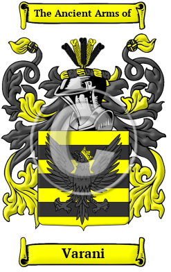 | Varani History, Family Crest & Coats of Arms Etymology of VaraniWhat does the name Varani mean? The distinguished surname Varani can be traced back to the ancient and beautiful region of Venice. Although people were originally known only by a single name, it became necessary for people to adopt a second name to identify themselves as populations grew and travel became more frequent. The process of adopting fixed hereditary surnames was not complete until the modern era, but the use of hereditary family names in Italy began in the 10th and 11th centuries. Italian hereditary surnames were developed according to fairly general principles and they were characterized by a profusion of derivatives coined from given names. The most common type of family name found in the region of Venice is the patronymic surname, which is derived from the father's given name. During the Middle Ages, Italians adopted the patronymic system of name-making because it perfectly complemented the prevailing Feudal System. In Italy the popularity of patronymic type of surname is also due to the fact that during the Christian era, people often named their children after saints and biblical figures. The surname Varani came from the Latin name Guarinus, which is in turn derived from the Old Germanic word wara, which means defense, protection. In Italy, the popularity of the personal name Guarino was influenced by the devotion to the saints bearing this name, especially for Saint Guarino from Bologna, Bishop of Palestrina of Rome. Early Origins of the Varani familyThe surname Varani was first found in Bologna (Latin: Bononia), one of the more prosperous cities at this early time. Records are found in the 12th century, when members of the Guarini family were involved in the government in Bologna. Early History of the Varani familyThis web page shows only a small excerpt of our Varani research. The years 1370, 1434, 1566 and 1567 are included under the topic Early Varani History in all our PDF Extended History products and printed products wherever possible. Varani Spelling VariationsItalian surnames have a surprising number of forms in comparison with other European surnames because they reflect the regional variations and the many dialects of the Italian language, each of which has its distinctive features. For example, in Northern Italy the most standard Italian surname suffix is "I", whereas in Southern Italy the most typical surname suffix is "O". Sardinian is very different from other forms of Italian and in fact, it is considered to be its own distinct language. Additionally, spelling changes frequently occurred because medieval scribes, church officials, and the bearers of names, spelled names as they sounded rather than according to any specific spelling rules. As a consequence of the major changes in the Italian language and in the local spellings of Italian surnames that occurred over the course of history, there are numerous variations for the surname Varani. These spelling variations include Guarino, Guarini, Gueriento, Gueriao, Guerino, Guerini, Garin, Varini, Varin, Guariniello and many more. Early Notables of the Varani familyGueriento, a Paduan painter born in 1370. He was highly influenced by famous painter Giotto, and was the centre of the school of painting at Padua. His works are today in museums in Padua, Bassano, and in the Doges' Palace in Venice. Battista Guarino was a humanist and educator in Ferrara in 1434; Francesco Guarini was Governor of Romagna in 1566; Giovan-Battista Guarini was a famous poet and diplomat in Ferrara at this time, and taught philosophy at the University of Ferrara. He worked in the... Another 86 words (6 lines of text) are included under the topic Early Varani Notables in all our PDF Extended History products and printed products wherever possible. Migration of the Varani familyThe records on immigrants and ships' passengers show a number of people bearing the name Varani: Josef Gueriao, a very early settler, who arrived in this state in 1779; A. M. Guarino, aged 28, who arrived at Ellis Island from Walino, in 1893; Agostino Guarino, aged 35, who arrived at Ellis Island from Mirabella, Italy, in 1923.