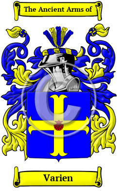 France Early Origins of the Varien familyThe surname Varien was first found in Burgundy (French: Bourgogne), an administrative and historical region of east-central France where this distinguished family held a family seat in the Franche-Comte, and were members of the aristocracy of that region. They also branched to Brittany at Colombier where they were elevated to the nobility in 1775, and to Normandy where they held a family seat at Prêteville and were elevated to the nobility in 1591, and to Lorraine where they were elevated to the nobility in 1513. In the Franche-Comté they were also seated at d'Audeux, and this branch were elevated to the nobility in 1611. Notable amongst the family was Jean Varin, French Sculptor, 1604-1672. Nicolas Varin, born in 1669, son of Nicolas and Jeanne of Groincour of Rouen, travelled from France to Canada in the 17th century. After arriving in the province of Quebec he married Marie-Anne Ronseray, daughter of Jean and Jeanne, at Boucherville on 29th October 1697. 1 Early History of the Varien familyThis web page shows only a small excerpt of our Varien research. Another 21 words (2 lines of text) covering the years 1584, 1604, 1634, 1647 and 1672 are included under the topic Early Varien History in all our PDF Extended History products and printed products wherever possible. Varien Spelling VariationsSpelling variations of this family name include: Varin, Varrin, Varine, Varrine, Varien, Varrien, Warin, Warrin, La Varin and many more. Early Notables of the Varien familyAnother 35 words (2 lines of text) are included under the topic Early Varien Notables in all our PDF Extended History products and printed products wherever possible.