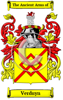 | Verduyn History, Family Crest & Coats of Arms Etymology of VerduynWhat does the name Verduyn mean? Verduyn is an ancient Norman name that arrived in England after the Norman Conquest of 1066. The Verduyn family lived in "La Roque and La Chesnaye-du-Bois [where] both maintain that it had its origin in the county of Mortaine, where one of its branches was of long continuance; yet it is incontestable that in the twelfth century there was a fief of Verdun in the arrondissement of Avranches; and, according to M, de Gerville, the cradle of the family was Barenton, in that neighbourhood." 1 Early Origins of the Verduyn familyThe surname Verduyn was first found in Buckinghamshire where they were descended from Bertram de Verdun, a Norman baronial name from Verdun, near Avranches in Normandy, where they were descended form the Counts of Verdun, and came to England in 1066 and was granted Farnham Royal in that shire. Tradition has it that on the day of the Coronation of William I, he provided a glove for the King's right hand. In 1095 he served as Sheriff of York. He also held lands in what is now known as Alveton or Alton in Staffordshire. 1 "On June 14, 1188, William de Humez, then Constable of Normandy, and Bertram de Verdon, were assessors of the King in a Curia sitting at Geddington. Bertram de Verdon, accompanying King Richard in the crusade of 1190, died at Jaffa in 1192, and was buried at Acre." 1 "The living [of Alveton], before the Reformation, was connected with the abbey of Croxden, to which the benefice was attached by Bertram de Verdun of Alton Castle, in 1176, after he had founded the abbey. The ruins of the castle still remain, on the summit of a rock 300 feet above the bed of the Churnet." 2 Bertram de Verdon or Verdun (d. 1192), was an early English judge, the son of Norman de Verdun and Luceline, daughter of Geoffrey de Clinton, Chamberlain to Henry I. "He founded in 1176 the Cistercian abbey of Croxden in Staffordshire, where his chief lands were. " 3 Theobald de Verdon (1248?-1309), was an English Baron, the son of John de Verdon (d. 1274), and his wife, Margaret de Lacy. "His grandfather, Theobald Butler, an Irish lord, married Rohese de Verdon, only daughter and heiress of Nicholas de Verdon, the last male representative of the Norman family of Verdon. They were lords of Farnham Royal in Buckinghamshire, of Brandon Castle in Warwickshire, and possessors of large estates in Leicestershire and Staffordshire, where their principal residence, Alveton (or Alton) Castle, was situated, and where also was their chief religious foundation, the Cistercian abbey of Croxden, established in 1176 by Bertram de Verdon. " 3 Early History of the Verduyn familyThis web page shows only a small excerpt of our Verduyn research. Another 71 words (5 lines of text) covering the years 1184, 1770, 1780, 1839 and 1870 are included under the topic Early Verduyn History in all our PDF Extended History products and printed products wherever possible. Verduyn Spelling VariationsMultitudes of spelling variations are a hallmark of Anglo Norman names. Most of these names evolved in the 11th and 12th century, in the time after the Normans introduced their own Norman French language into a country where Old and Middle English had no spelling rules and the languages of the court were French and Latin. To make matters worse, medieval scribes spelled words according to sound, so names frequently appeared differently in the various documents in which they were recorded. The name was spelled Verdon, Verdan, Verdin, Verdun and others. Early Notables of the Verduyn familyMore information is included under the topic Early Verduyn Notables in all our PDF Extended History products and printed products wherever possible. Migration of the Verduyn family to IrelandSome of the Verduyn family moved to Ireland, but this topic is not covered in this excerpt. Another 36 words (3 lines of text) about their life in Ireland is included in all our PDF Extended History products and printed products wherever possible. Migration of the Verduyn familyBecause of this political and religious unrest within English society, many people decided to immigrate to the colonies. Families left for Ireland, North America, and Australia in enormous numbers, traveling at high cost in extremely inhospitable conditions. The New World in particular was a desirable destination, but the long voyage caused many to arrive sick and starving. Those who made it, though, were welcomed by opportunities far greater than they had known at home in England. Many of these families went on to make important contributions to the emerging nations of Canada and the United States. Analysis of immigration records indicates that some of the first North American immigrants bore the name Verduyn or a variant listed above: Richard Verdin settled in Virginia in 1655; Richard Verdan settled in Philadelphia in 1872.