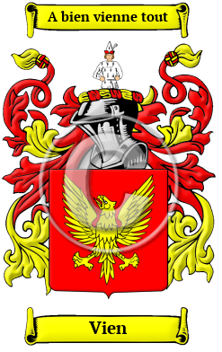 France Early Origins of the Vien familyThe surname Vien was first found in Burgundy (French: Bourgogne), an administrative and historical region of east-central France where this renowned family held a family seat since ancient times. Descendants of this family divided into numerous branches as they prospered and established themselves in various regions. The Mirebeau branch of the family was established by Jean Vienne, Lord of Mirebel-en-Montagne around 1283, and one of his descendants was the Chamberlain to the Duke in 1399. Another Jean de Vienne was the Admiral of France in 1373, but unfortunately, he was killed at Nicopolis in 1396. Many members of this family were granted lands and titles in recognition of their bravery and acts of heroism displayed on the battlefield. Philippe, Hugues V's son, was the founder of the branch of the family of Lords of Pimont, Ruffey and the Counts of Commarin, during the 1300's. Notable among this branch of the family are: Gérard, Knight of the Order of the King and of Queen Eléonore of Hungary, Knight of Honour in the Parliament of Dijon in 1515; Jean, Baron of Ruffey, Governor of Bourbonnais and a Knight of Orders; Jacques-François, Lieutenant-General in Bourgogne, and the father of Charles, Baron of Châteauneuf and of Chevreau, and the Lieutenant-General of armies; Henri, Count of Commarin and the Lieutenant-General of Commarin who resigned in 1671; and Louis-Henri, Count of Vienne and Colonel of the Cavalry who died in 1793. A distinguished author of his time, Joseph Marie Vien, known also as "the Elder," lived from 1716 to 1809. Other branches of this noble family include the Barons of Chevreau, the Pagny branch, the Lords of Rollans and of Listenois, the Barons of Clairvaux, and the Lords of Saint-Georges and of Sainte-Croix. The family were deeply religious and some members of the family joined the clergy. The Archbishops of Besançon and of Rouen, and the Priests of Langres and of Chalon were from this family. Jean Vien, born in 1648, son of Vivien-Jean and Suzanne (née Herault), travelled from France to Canada in the 17th century. After arriving in Quebec he married Catherine Gateau, born in 1651, daughter of Odart and Genevieve (née Drouet), on 29th November 1671. They remained together in Quebec and had children that all carried on the surname of Vien or Viens. 1 Early History of the Vien familyThis web page shows only a small excerpt of our Vien research. Another 98 words (7 lines of text) covering the years 1180, 1256 and 1373 are included under the topic Early Vien History in all our PDF Extended History products and printed products wherever possible. Vien Spelling VariationsSpelling variations of this family name include: Vienne, Viennes, Viene, Vienes, Vyenne, Vyennes, Vyene, Vyenes, Vien, Viens, Vyen, Vyens, Le Vienne and many more. Early Notables of the Vien family- Jean de Vienne, Admiral of France in 1373