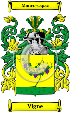 | Vigne History, Family Crest & Coats of Arms Etymology of VigneWhat does the name Vigne mean? The history of the Vigne family goes back to the Medieval landscape of northwestern France, to the regions known as Brittany and Normandy. The name Lavigne is derived from the Old French word "vigne," meaning "vine," and as such it is likely that the first bearers of this name owned or worked on a vineyard. 1 Early Origins of the Vigne familyThe surname Vigne was first found in Brittany where they held a family seat in the seigneury of Haute Morays. They later branched to Houle in that same province. They were closely allied to this latter House of Houlle de Kermassonet. Branching to the region of Tournai they intermarried with the family of Hennebert. Branches were later found in Maine, Le Mans, Bourbonnais, Guyenne, and Artois. In the south of France they held a family seat in the region of Languedoc at Puylaroque. Joseph Lavigne, son of Pierre and Jeanne (née Gazaille), settled in Contrecoeur, Quebec and married Marie-Anne Gareau on 12th November 1727. 2 Early History of the Vigne familyThis web page shows only a small excerpt of our Vigne research. More information is included under the topic Early Vigne History in all our PDF Extended History products and printed products wherever possible. Vigne Spelling VariationsFrench surnames were subject to numerous alterations in spelling because of the various cultural groups that inhabited specific regions. Eventually, each region possessed its own local dialect of the French language. The early development of the French language, however, was also influenced by other languages. For example, Old French was infused with Germanic words and sounds when barbarian tribes invaded and settled in France after the fall of the Roman Empire. Middle French also borrowed heavily from the Italian language during the Renaissance. As a result of these linguistic and cultural influences, the name Vigne is distinguished by a number of regional variations. The many spelling variations of the name include Lavigne, Levine, Levin, Levigne, Levigny, Laveine, Lavignes, Lavene, Des Vignes, deVigne, Devignes, Devigne, De lavigne and many more. Early Notables of the Vigne family- the Lavigne family of Hautemorays