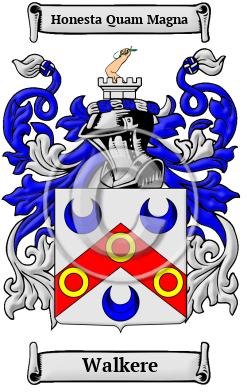 | Walkere History, Family Crest & Coats of Arms Etymology of WalkereWhat does the name Walkere mean? The history of the name Walkere dates back to the ancient Anglo-Saxon culture of Britain. It is derived from a member of the family who worked as a fuller, whose job it was to scour and thicken raw cloth by beating it and trampling it in water. The surname Walkere is derived from the Old English word wealcere, which means fuller. "In the North of England, fullers' earth is called 'walker's clay,' and a fulling-mill a 'walk-mill.' In Scotland, to walk, still means to full cloth." 1 This occupation has a long history as "cloth before the introduction of the roller had to be trodden underfoot. In Wyckliffe’s version of the Transfiguration he describes Christ’s raiment as shining so as no 'fullers or walkers of cloth' could whiten." 2 Early Origins of the Walkere familyThe surname Walkere was first found in Yorkshire, where they were believed to be descended from a very ancient tribe called the Wealceringas, and the name is considered to be one of the oldest in England. Their early records have been obscured but in the 12th century, they were recorded as landholders in Yorkshire. "This name is mainly characteristic of the midlands and of the north of England. It is comparatively infrequent in the counties between the Wash and the Thames. It is absent or rare in the southern part of England south of a line joining the mouths of the Thames and the Severn. Its great home in the midlands is in the counties of Derby and Nottinghamshire. In the north it is most frequent in Durham and Yorkshire." 3 One of the first records of the family was Richard le Walkere, recorded in Warwickshire c. 1248. The Assize Rolls of 1260 listed Robert le Walker in 1260. 4 Later, Richard le Walker was rector of the church of St. Elphin, Warrington, Lancashire in 1396. 5 Early History of the Walkere familyThis web page shows only a small excerpt of our Walkere research. Another 128 words (9 lines of text) covering the years 1248, 1260, 1324, 1361, 1563, 1597, 1599, 1611, 1616, 1618, 1640, 1643, 1658, 1661, 1665, 1673, 1676, 1677, 1688, 1699, 1704, 1725, 1744 and 1890 are included under the topic Early Walkere History in all our PDF Extended History products and printed products wherever possible. Walkere Spelling VariationsOnly recently has spelling become standardized in the English language. As the English language evolved in the Middle Ages, the spelling of names changed also. The name Walkere has undergone many spelling variations, including Walker, Walkere and others. Early Notables of the Walkere familySir Edward Walker (1611-1677), Garter King of Arms in 1676; Robert Walker (c. 1597-1673), an English merchant and politician who sat in the House of Commons of England (1640-1643) and (1661-1673), a strong Royalist during the English Civil War; Robert Walker (1599-1658), an English portrait painter, notable for his portraits of the "Lord Protector" Oliver Cromwell and other distinguished... Another 59 words (4 lines of text) are included under the topic Early Walkere Notables in all our PDF Extended History products and printed products wherever possible. Migration of the Walkere family to IrelandSome of the Walkere family moved to Ireland, but this topic is not covered in this excerpt. Another 135 words (10 lines of text) about their life in Ireland is included in all our PDF Extended History products and printed products wherever possible. Migration of the Walkere familyTo escape the unstable social climate in England of this time, many families boarded ships for the New World with the hope of finding land, opportunity, and greater religious and political freedom. Although the voyages were expensive, crowded, and difficult, those families that arrived often found greater opportunities and freedoms than they could have experienced at home. Many of those families went on to make significant contributions to the rapidly developing colonies in which they settled. Early North American records indicate many people bearing the name Walkere were among those contributors: John Walker, Roger Walker, and Isabel Walker, who all immigrated to Virginia in 1623; Augustine Walker, who settled in Lynn, Massachusetts in 1630; James Walker, who arrived in St. Christopher in 1635.