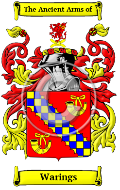 | Warings History, Family Crest & Coats of Arms Etymology of WaringsWhat does the name Warings mean? Warings is one of the names that was brought to England in the wave of migration following the Norman Conquest of 1066. The Warings family name comes from the Old French personal name Guarin meaning to shelter or protect. 1 Another source notes that Warin was a fairly common Norman personal name. 2 Early Origins of the Warings familyThe surname Warings was first found in Devon at Waringstown where the family are descended from John Waring who later settled in Ireland temp. James I. It was there he founded another Waringstown, a village in County Armagh. Waring's son, Samuel, brought Flemish weavers to the village, built Huguenot style cottages for them, some of which survive today. The patriarch of the family was Miles Sire de Guerin, who came to England with William the Conqueror in 1066. 3 He was originally a vassal of the Odo, the Bishop of Bayeaux. Sometimes appearing as a forename, we found an early Latin entry for Warinus filius Toruerdi in London in 1142. Robert Warin was listed in the Curia Regis Rolls for Yorkshire in 1198 and John Waryng was found in the Subsidy Rolls for Worcertershire in 1275. 2 Early History of the Warings familyThis web page shows only a small excerpt of our Warings research. Another 66 words (5 lines of text) covering the years 1600, 1610, 1614, 1638, 1658, 1660, 1671, 1678, 1679, 1681, 1683, 1685, 1687 and 1890 are included under the topic Early Warings History in all our PDF Extended History products and printed products wherever possible. Warings Spelling VariationsThe English language only became standardized in the last few centuries. For that reason, spelling variations are common among many Anglo-Norman names. The shape of the English language was frequently changed with the introduction of elements of Norman French, Latin, and other European languages; even the spelling of literate people's names were subsequently modified. Warings has been recorded under many different variations, including Waring, Wareing, Waringe, Wearing and others. Early Notables of the Warings familyRobert Waring (1614-1658), an English author, descended from an old Staffordshire family settled at 'the Lea' in the time of Henry VIII. "His father was Edmund Waring and his mother the daughter of Richard Broughton of Owlbury. " 4