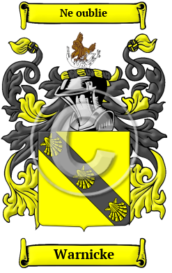 Scotland Ireland Early Origins of the Warnicke familyThe surname Warnicke was first found in Ayrshire (Gaelic: Siorrachd Inbhir Àir), formerly a county in the southwestern Strathclyde region of Scotland, that today makes up the Council Areas of South, East, and North Ayrshire, where they held a family seat from very ancient times, some say before the Norman invasion of 1066. They were originally a sept of the Grahams (hence the same escallops and colours as the Graham Coat of Arms) and known as the Mac-Gille-Warnocks, and gave their name to the parish of Gaitgillmakkilwernock in Kirkcudbrightshire. The Clan was more properly known as the MacIlvernocks. Some of the first records of the family include: Robert Warnot (probably the same name) who had a remission for his share in holding Dumbarton Castle against the king in 1489 and Andree Warnoche in Lanark who had a remission in 1505. Later, James Warnok was a witness in Ayrshire in 1562. 1 Early History of the Warnicke familyThis web page shows only a small excerpt of our Warnicke research. Another 89 words (6 lines of text) covering the years 1185, 1320, 1489, 1602, 1688 and 1890 are included under the topic Early Warnicke History in all our PDF Extended History products and printed products wherever possible. Warnicke Spelling VariationsSpelling variations of this family name include: Warnock, MacGilvernock, Warnick, Warnoch, McIlvernock, M'Illvernoche and many more. Early Notables of the Warnicke familyMore information is included under the topic Early Warnicke Notables in all our PDF Extended History products and printed products wherever possible. Migration of the Warnicke family to IrelandSome of the Warnicke family moved to Ireland, but this topic is not covered in this excerpt. Another 81 words (6 lines of text) about their life in Ireland is included in all our PDF Extended History products and printed products wherever possible. Migration of the Warnicke familySome of the first settlers of this family name or some of its variants were: John Warnock who settled in Newcastle, Del. in 1789; John and Jane Warnock settled in New York in 1823; Hugh, James, John, Joseph, Robert, Samuel, Thomas, and William Warnock, all arrived in Philadelphia between 1850 and 1860.