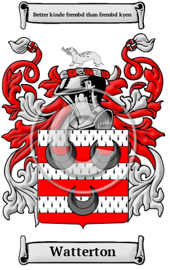 | Watterton History, Family Crest & Coats of Arms Etymology of WattertonWhat does the name Watterton mean? The history of the Watterton family name begins after the Norman Conquest of 1066. They lived in Lincolnshire, at Waterton. Early Origins of the Watterton familyThe surname Watterton was first found in Lincolnshire where they held a family seat as Lords of the manor of Waterton from the time of the Norman Conquest in 1066. The now abandoned village dated back to the Domesday Book where the lands and manor were held by Fulcric. 1 While there can be doubt that Lincolnshire is the original home of this illustrious family, we must look to Yorkshire to see the family's true achievements. For it was here that Rayner de Waterton was Lord of the manor of Waterton about 1100, Sir Robert Waterton was Master of the Horse to Henry IV., and John Wateron served King Henry V. at Agincourt who served the same office where from this place. 2 An old ballad says "Waterton the banner bore, of famed St. George at Agincourt." Early History of the Watterton familyThis web page shows only a small excerpt of our Watterton research. Another 79 words (6 lines of text) covering the years 1340, 1360, 1409, 1425 and 1460 are included under the topic Early Watterton History in all our PDF Extended History products and printed products wherever possible. Watterton Spelling VariationsAnglo-Norman names tend to be marked by an enormous number of spelling variations. This is largely due to the fact that Old and Middle English lacked any spelling rules when Norman French was introduced in the 11th century. The languages of the English courts at that time were French and Latin. These various languages mixed quite freely in the evolving social milieu. The final element of this mix is that medieval scribes spelled words according to their sounds rather than any definite rules, so a name was often spelled in as many different ways as the number of documents it appeared in. The name was spelled Watterton, Wateton, Waterton, Watertown and others. Early Notables of the Watterton familyRayner de Waterton, Lord of the manor of Waterton; and Robert Waterton, (c. 1360-1425), the trusted servant of the House of Lancaster under three monarchs, Henry IV, Henry V, and Henry VI. He was Constable of Pontefract Castle... Another 37 words (3 lines of text) are included under the topic Early Watterton Notables in all our PDF Extended History products and printed products wherever possible. Migration of the Watterton family to IrelandSome of the Watterton family moved to Ireland, but this topic is not covered in this excerpt. More information about their life in Ireland is included in all our PDF Extended History products and printed products wherever possible. Migration of the Watterton familyBecause of the political and religious discontent in England, families began to migrate abroad in enormous numbers. Faced with persecution and starvation at home, the open frontiers and generally less oppressive social environment of the New World seemed tantalizing indeed to many English people. The trip was difficult, and not all made it unscathed, but many of those who did get to Canada and the United States made important contributions to the young nations in which they settled. Some of the first North American settlers with Watterton name or one of its variants: J.D. Watertown who landed in New England in 1650; Michael Waterton sailed to Maryland in 1665.