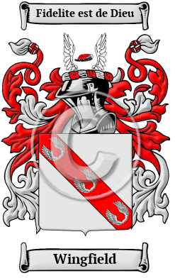 | Wingfield History, Family Crest & Coats of Arms Early Origins and Etymology of WingfieldThe surname Wingfield was first found in Suffolk at Wingfield, an ancient Saxon village that dates back to c. 1035 when it was listed as Wingefeld and probably meant "open land of the family or followers of a man called Wiga," from the Old English personal name + "-inga" + "feld." 1 "The Wingfields of Wingfield and Letheringham, both in Suffolk, a distinguished family of the fourteenth and fifteenth centuries, are traced nearly to the Conquest, though they do not appear to have been lords of the manor or castle of Wingfield before the reign of Edward II. " 2 Wingfield Castle, was the ancestral home of the Wingfield family and their heirs. Of note was Sir John de Wingfield (died c. 1361), Chief Administrator to Edward the Black Prince, a title received c. 1351 as a result of his devotion his prince including Crecy in 1346 and in the Normandy campaign in 1347-1348. Wingfield College "was founded on the south side of the church [of Wingfield] by the will of Sir John Wingfield, in 1362, for a provost and nine priests." 3 Early History of the Wingfield familyThis web page shows only a small excerpt of our Wingfield research. Another 105 words (8 lines of text) covering the years 1361, 1403, 1454, 1456, 1464, 1523, 1525, 1533, 1534, 1536, 1539, 1545, 1550, 1551, 1552, 1560, 1597, 1621, 1626, 1628, 1634, 1660 and 1677 are included under the topic Early Wingfield History in all our PDF Extended History products and printed products wherever possible. Wingfield Spelling VariationsSpelling variations of this family name include: Winfield, Wingfield and others. Early Notables of the Wingfield family- Sir John Wingfield (d. 1361), High Steward and Councilor to the Prince of Wales, who accompanied the Prince on his campaigns in France, Chief Administrator to Edward the Black Prince