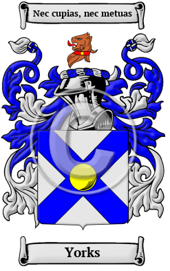 | Yorks History, Family Crest & Coats of Arms Etymology of YorksWhat does the name Yorks mean? The name Yorks is of Anglo-Saxon origin and came from when the family lived in Yorkshire, the largest county in northern England, which is divided into three administrative ridings: North Riding, West Riding, and East Riding. The town of York was the military capital of Roman Britain, the capital of Northumbria, and was the seat of an Archbishop. Yorkshire was also the home of the House of York, which was an English royal dynasty from 1461 to 1485. The reigning members of the House of York were Edward IV, Edward V and Richard III. Their rivalry with the House of Lancaster resulted in the Wars of the Roses, which lasted from 1455 to 1485 and ended when the Lancastrian Henry VII united the two houses by marrying Elizabeth, the daughter of Edward IV. The surname Yorks belongs to the large category of Anglo-Saxon habitation names, which are derived from pre-existing names for towns, villages, parishes, or farmsteads. Early Origins of the Yorks familyThe surname Yorks was first found in Wiltshire where they were first listed at Carne, and soon after the Conquest branched to Fillack in Cornwall, and Wellington in Somerset. The church parish of Guilden Morden in Cambridgeshire has an interesting story about the family. "The parish appears to have taken the affix to its name from the decoration of the steeple of its church with stripes of gilding. It is recorded that Charles Yorke, son of the first lord Hardwicke, died suddenly while the patent for raising him to the peerage by the title of Baron Morden, taken from this place, was in preparation." 1 And in Wimpole, Cambridgeshire more early records were found of the family. The reader should note that Philip Yorke, 1st Baron Hardwicke, Lord Chancellor of Great Britain from 1737 to 1756 was the first Earl of Hardwicke. "This place, which is on the road from Royston to Huntingdon, is remarkable as the residence of the Earl of Hardwicke, whose magnificent seat of Wimpole Hall, splendidly embellished, and surrounded by a beautiful demesne, was visited by Her Majesty and Prince Albert in October 1843. The church, which has been enlarged by fitting up a private chapel with seats, contains various monuments to the Yorke family, including one to the memory of Lord Chancellor Hardwicke, who was interred here." 1 One of the first records was William of York (d. 1256), Bishop of Salisbury. " In 1242 he was one of the king's two representatives sent to the parliament of 29 Jan. to ask for money and counsel for the French war, and when the king departed for Gascony he, the archbishop of York, and William de Cantelupe were entrusted with the custody of the realm. " 2 Early History of the Yorks familyThis web page shows only a small excerpt of our Yorks research. Another 164 words (12 lines of text) covering the years 1461, 1549, 1569, 1572, 1588, 1595, 1609, 1654, 1658, 1666, 1687, 1689, 1690, 1695, 1705, 1707, 1711, 1716, 1764 and 1770 are included under the topic Early Yorks History in all our PDF Extended History products and printed products wherever possible. Yorks Spelling VariationsIt is only in the last few hundred years that the English language has been standardized. For that reason, early Anglo-Saxon surnames like Yorks are characterized by many spelling variations. As the English language changed and incorporated elements of other European languages, even literate people changed the spelling of their names. Scribes and monks in the Middle Ages spelled names they sounded, so it is common to find several variations that refer to a single person. The variations of the name Yorks include: York, Yorke and others. Early Notables of the Yorks familySir John York or Yorke (died 1569?), an English merchant and politician, Master of the Mint, Sheriff of London in 1549