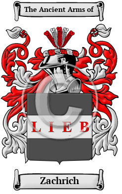 Germany Etymology of ZachrichWhat does the name Zachrich mean? This name is derived from Zacharias, derived from the Hebrew given name Zechariah or Zaccaria, a fairly popular name in the 14th century. This name was borne by a Biblical prophet and in the New Testament by the father of John the Baptist. 1 Zacharias survives today as a mostly German surname. Alternatively, the name could have been a German occupational name for a sexton or churchwarden from the Middle German "sigiste." Originally, the sexton was a "the officer in a church in charge of the sacred vessels and vestments’, not, as now, the grave-digger." 2 Another source claims the name was from the Medieval Latin "sacrista." Early Origins of the Zachrich familyThe surname Zachrich was first found in Bavaria, where the family were anciently associated with the tribal conflicts of the area. They declared allegiances to many nobles and princes of early history, lending their influence in struggles for power and status within the region. They branched into many houses, and their contributions were sought by many leaders in their search for power. Early History of the Zachrich familyThis web page shows only a small excerpt of our Zachrich research. Another 95 words (7 lines of text) covering the years 1508 and 1587 are included under the topic Early Zachrich History in all our PDF Extended History products and printed products wherever possible. Zachrich Spelling VariationsSpelling variations of this family name include: Secrest, Zachreiss, Zecrest, Zacrest, Secreiss, Sacreiss, Sechreiss, Sachreiss, Zachrest, Zachreisst, Zechreiss, Zechreisst, Sacreisst, Secreisst, Secresst, Sacresst, Zecresst and many more. Early Notables of the Zachrich familyMore information is included under the topic Early Zachrich Notables in all our PDF Extended History products and printed products wherever possible. Migration of the Zachrich familySome of the first settlers of this family name or some of its variants were: Johannes Zachrias, who settled in Philadelphia in 1736; and a Johan Georg Zachrias, who was on record in Philadelphia in 1749.