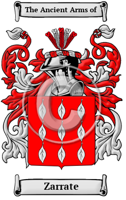 The distinguished surname Zarrate is of Spanish origin, derived from the name place where the initial bearer of the name resided. In this instance, the surname is derived from the place-name Zárate, located in the district of Zuya (Victoria) in northern Spain. According to etymologists, the place-name Zárate is derived from the Basque words "zara" meaning "forest" and "at(h)e" meaning "door," thus signifying "opening to the forest."