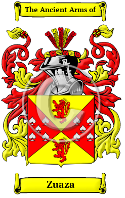 The noble family name Zuaza is of Spanish descent, and appears to be of local origin, deriving from a topographic feature, near the place of residence of the initial bearer. Etymologically, the local name Zuaza is derived from the Basque word "zuartz" meaning "tree" and the suffix "-azo" meaning "abundance of." Thus, the surname Zuaza signifies "dweller at the abundance of trees or forest."